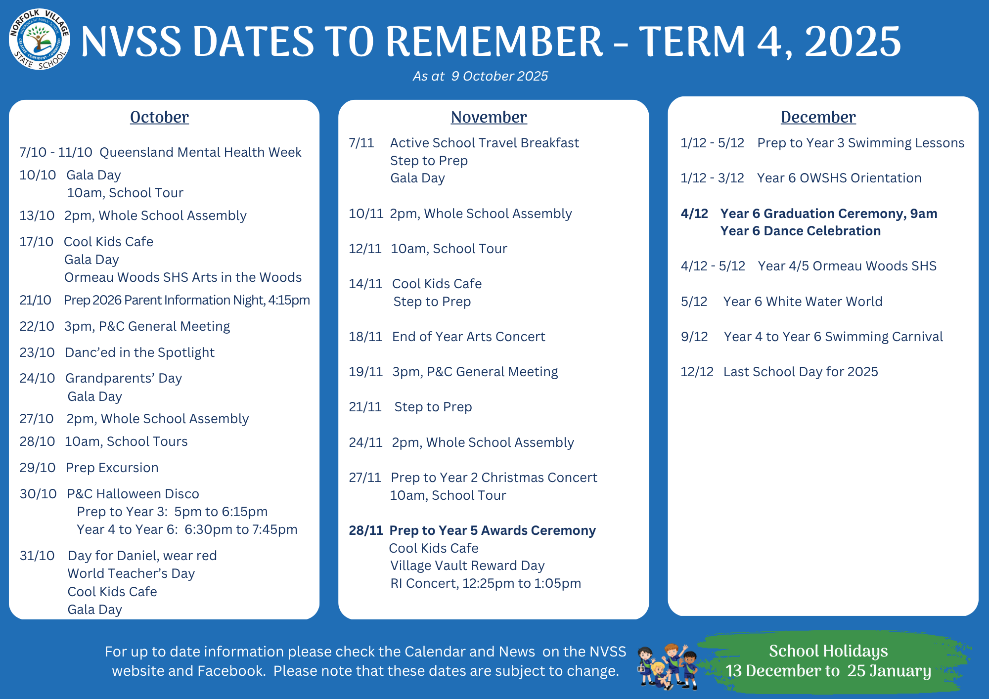 Parents are responsible for updating their details with the office to ensure information is received. We also suggest parents and carers check their 'Junk' folders and redirect NVSS emails to their 'Inbox' if necessary.